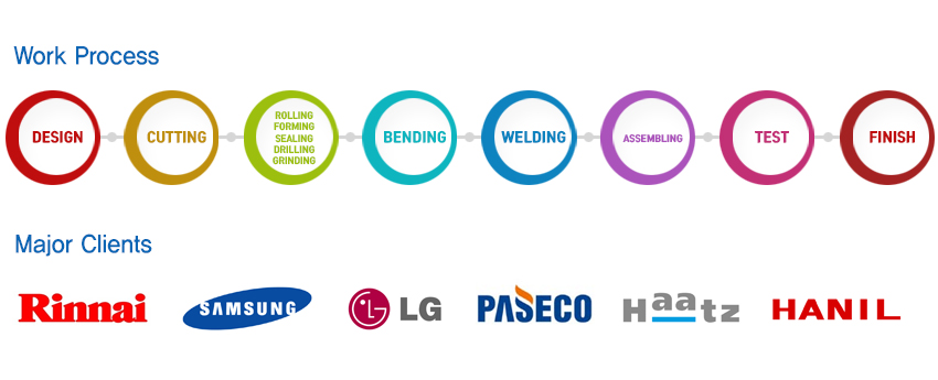 제품의 설계, 파이프 절단, 성형 및 가공, CNC 벤딩, 용접, 조립, 검사까지 공장 내에서 일괄생산 합니다. 오랜기간 축적된 노하우를 바탕으로 한 설계능력과 최고의 기술력, 최첨단 가공설비 및 측정장비 등을 갖추고 엄격한 품질관리를 통한 고품질의 제품을 신속하게 생산하고 있습니다. 이러한 One-Stop System을 제공하여 고객의 소중한 시간과 원가를 절약하고, 고객이 요구하는 최상의 품질을 확보하여 고객의 기업경쟁력 향상에 이바지 하고 있습니다.