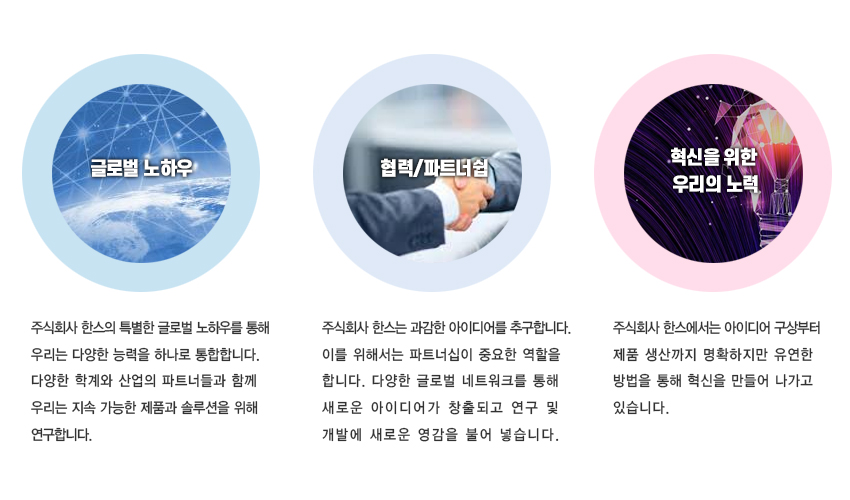 효과적이고 효율적인 연구 및 기술개발을 통한 혁신은 주식회사 한스의 성장을 위한 원동력이 됩니다. 주식회사 한스는 지속가능한 미래를 위해 혁신적인 프로세스, 기술, 그리고 제품을 개발하고 전 세계의 연구에서 디지털화를 지향합니다. 이러한 연구와 혁신이 주식회사 한스가 앞선 기술력으로 전 사업분야에서 장기적인 성공을 이룰 수 있는 이유입니다.